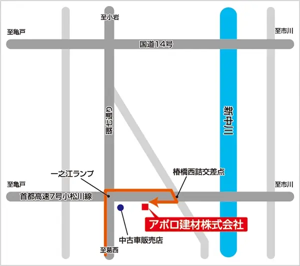 京葉道路上り 篠崎下車国道14号谷河内交差点を左方向、高速下道に沿って1.5km直進、左側にございます。(篠崎より6分)
