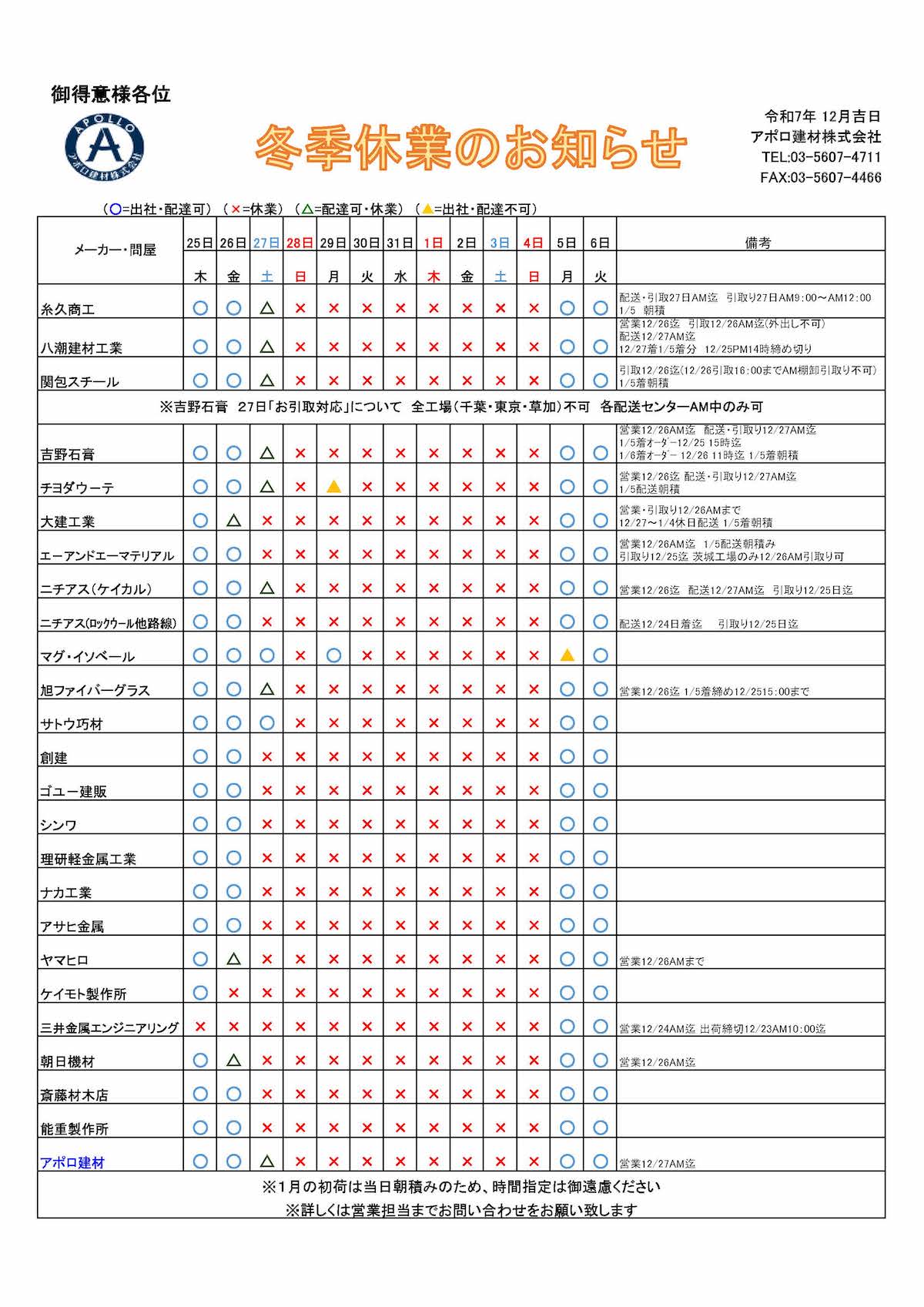冬季休業のお知らせ お知らせ 2025.12.12 平素は格別のお引き立てをいただき厚くお礼申し上げます。弊社では、誠に勝手ながら下記日程を冬季休業とさせていただきます。 皆様には大変ご不便をおかけいたしますが、何卒ご理解の程お願い申し上げます。 アポロ建材_冬季休業2025年ダウンロード