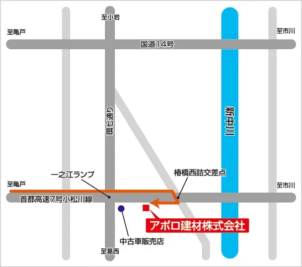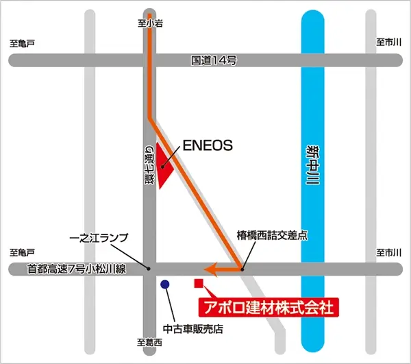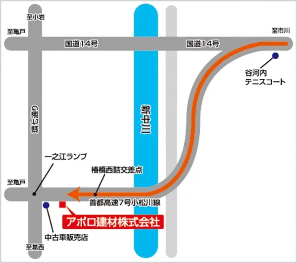 京葉道路上り 篠崎下車国道14号谷河内交差点を左方向、高速下道に沿って1.5km直進、左側にございます。(篠崎より6分)